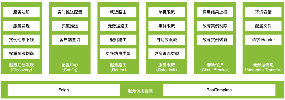 Spring Cloud Tencent 主要提供了微服务领域常见的服务注册与发现、配置中心、服务路由、限流熔断、服务监控以及元数据链路透传能力。