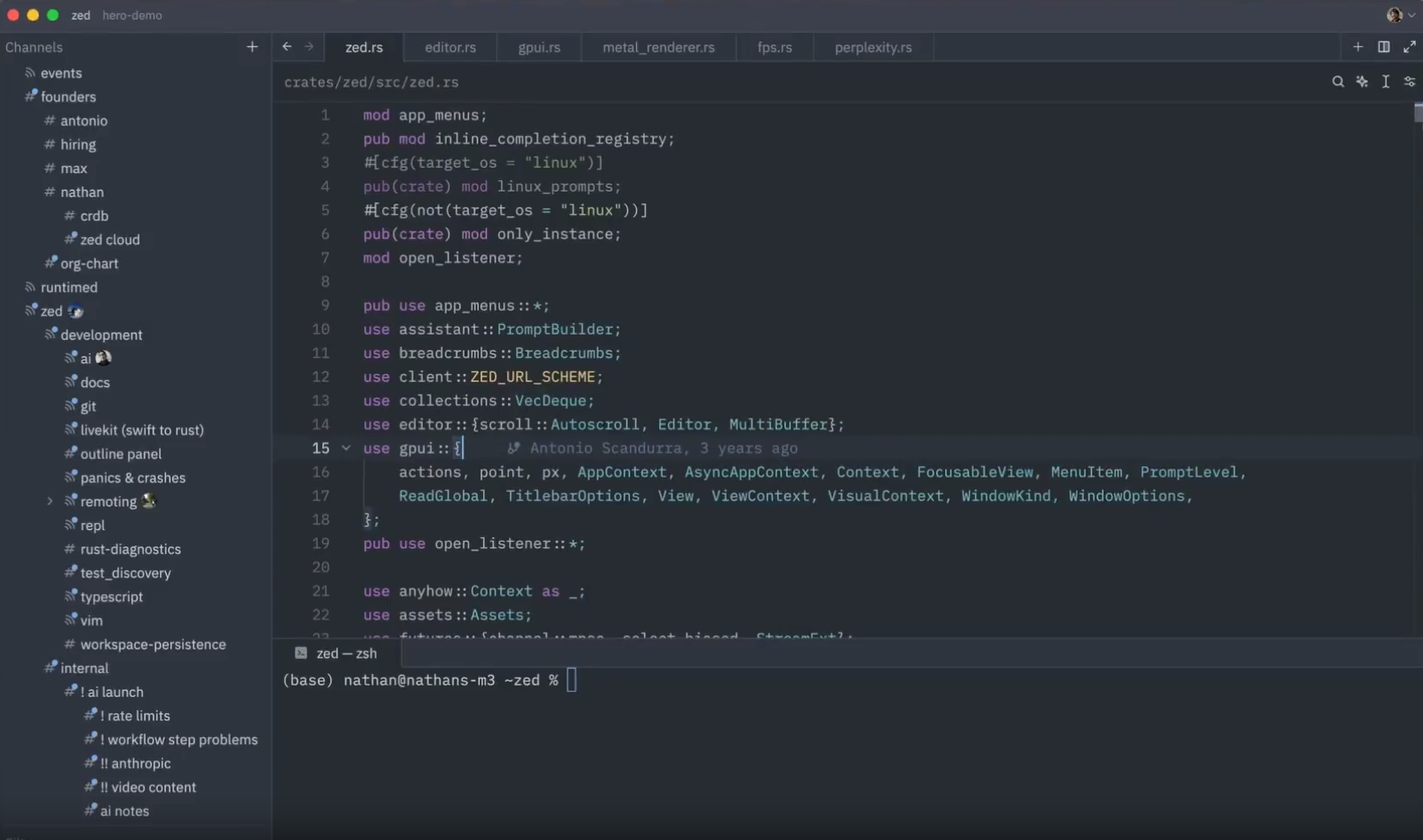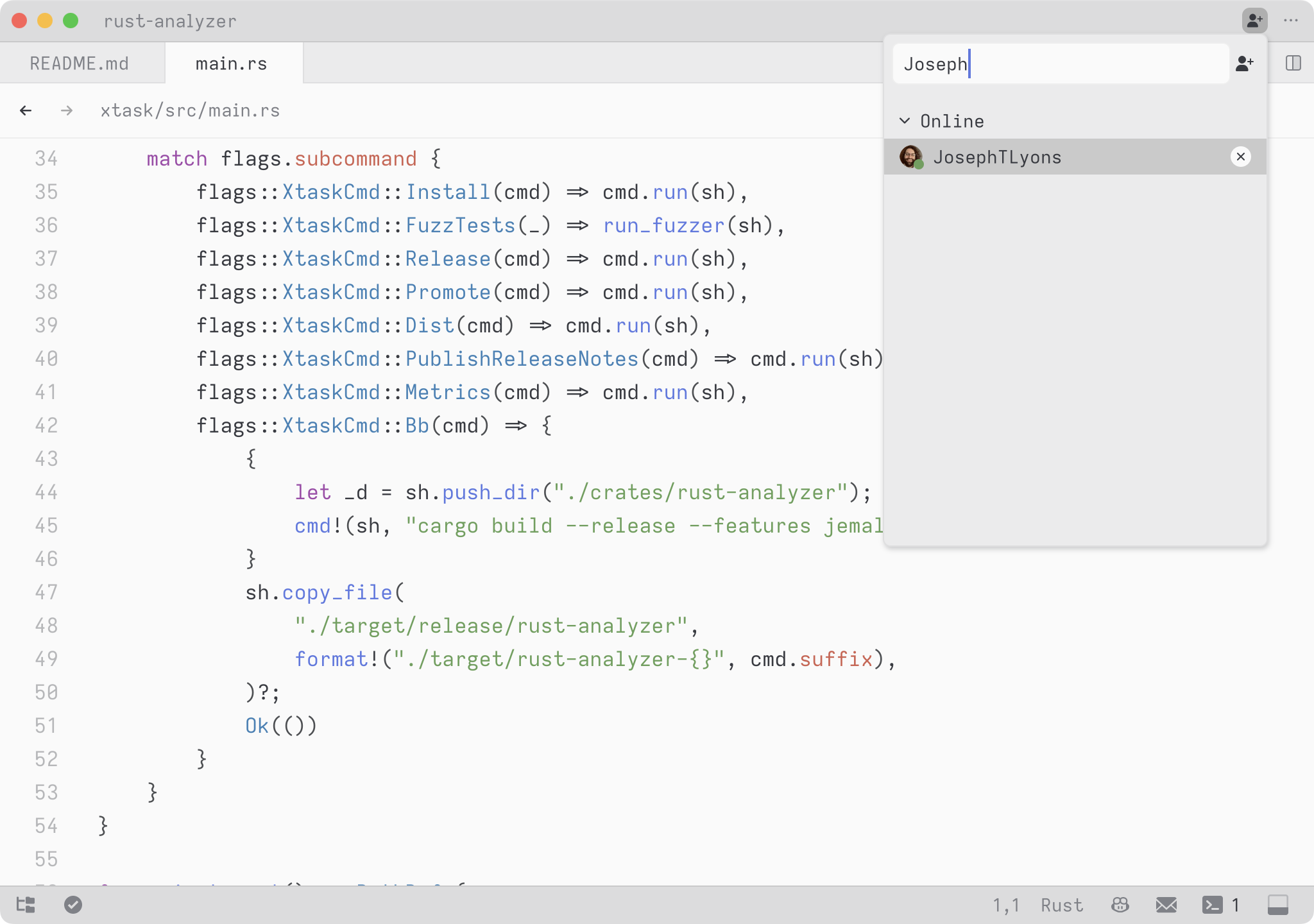 启动只需毫秒级,打字没有丝毫延迟。告别“卡顿与风扇齐鸣”,Zed 就是那种越用越上头的编辑器。实时协作