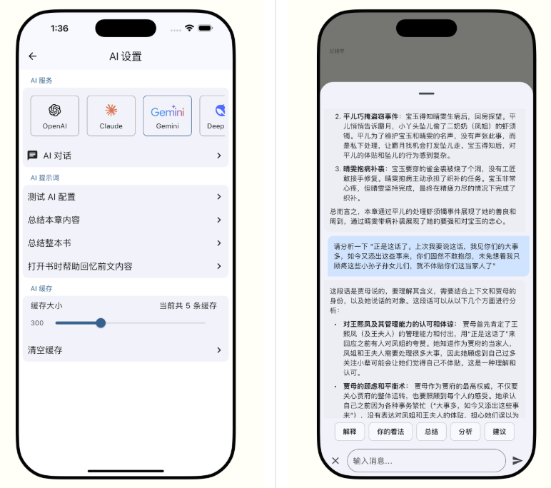- 智能AI助手:集成了OpenAI、DeepSeek、Claude、Gemini等顶尖AI服务,一键激活,阅读更智能。