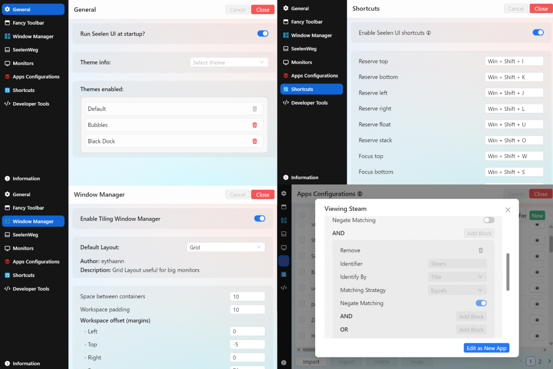 安装完成后,启动Seelen-UI,你会看到一个直观的配置界面。在这里你可以根据提示逐步设置主题偏好、窗口管理规则、快捷操作等。所有设置都是图形化的,只需要点点鼠标就能完成,不需要编写复杂的配置文件