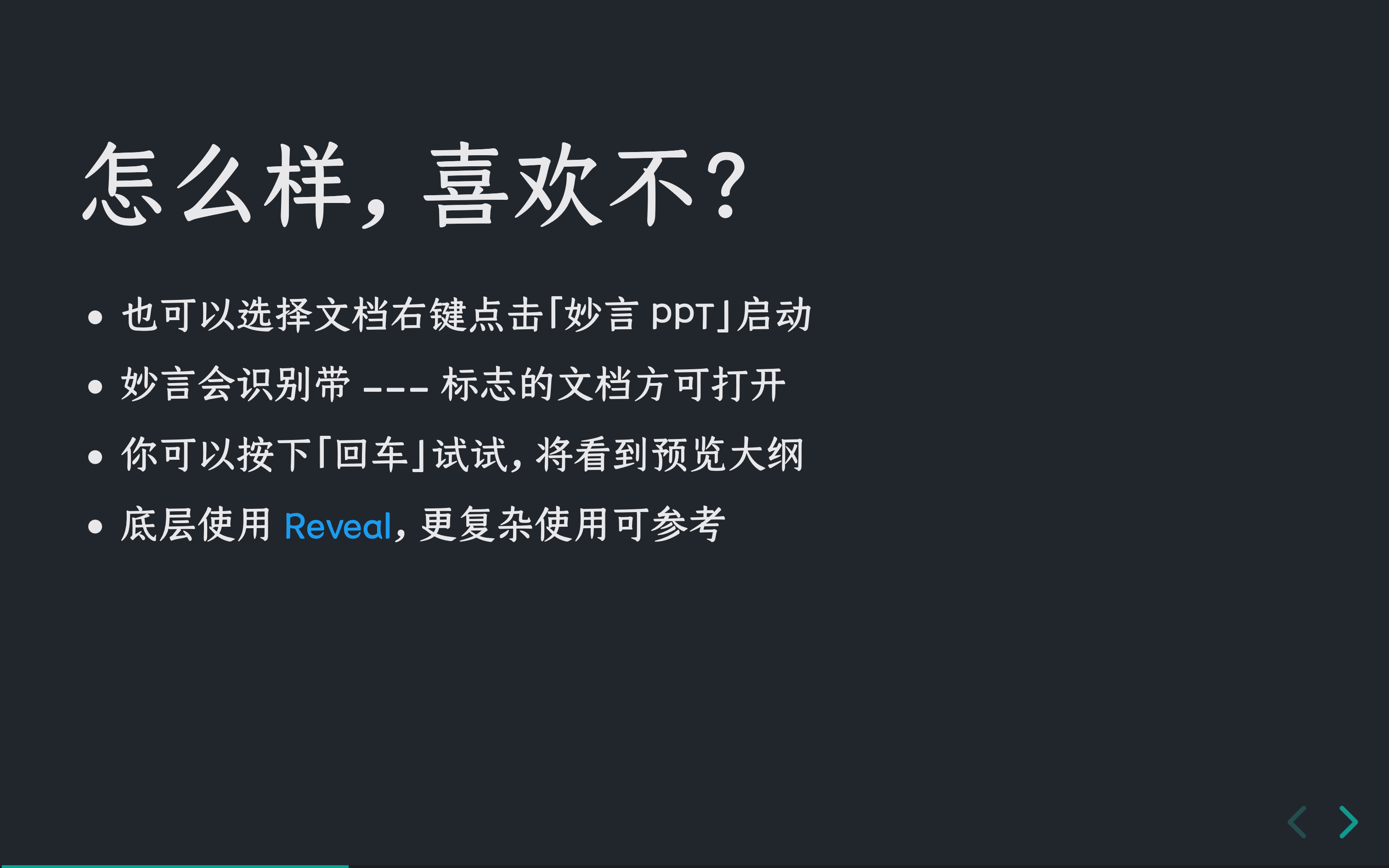 妙言有一个特殊的功能点就是,可以直接通过文字的编辑来快速进行 PPT 的演示。