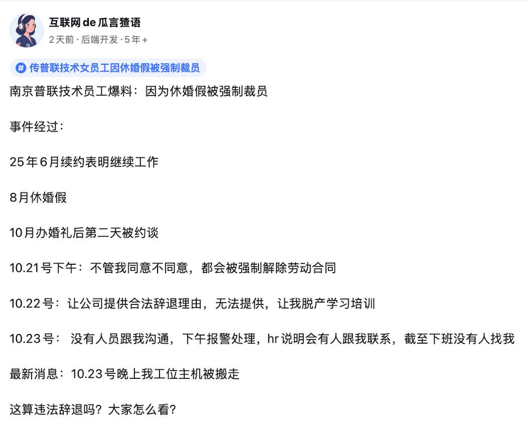 这两天在脉脉上刷到一条爆料,看完真的让人五味杂陈。一位互联网公司的技术员工,6 月刚续约表明要继续工作,8 月休了个婚假,10 月办完婚礼回来第二天就被约谈了。公司直接告诉他:不管你同意不同意,都会被强制解除劳动合同。