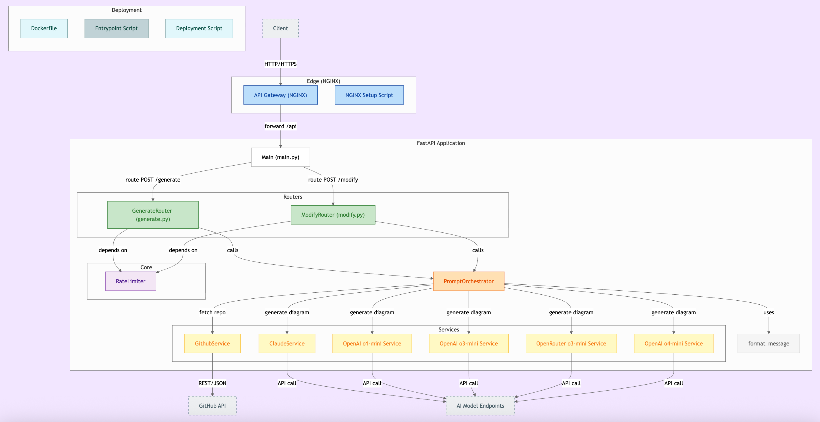 GitDiagram 是一个让你把任意一个(或私有,也支持授权) GitHub 仓库,快速转换成结构图(目录 → 模块 → 文件)并且还带有交互功能(点击图中的组件跳到对应源码或目录)工具。 它不仅仅是静态的图片,而是“图”中每个节点都可以直接链接回对应的源码或文件夹。你可以想象:你打开一个大项目,一口气看到它的整体结构,再点击想看的模块立即跳进去,省去了在 IDE 里层层展开的烦恼。