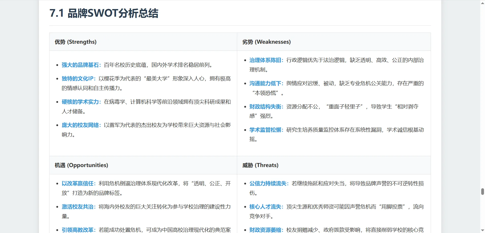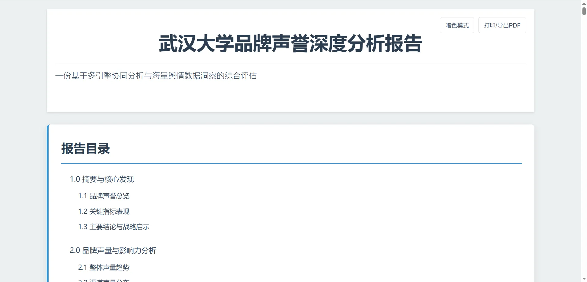 以 “武汉大学舆情” 为分析案例,系统可生成包含 8 章 25 小节的深度报告,涵盖品牌声量、用户画像、风险机遇等多维度内容,专业度堪比咨询公司出品。