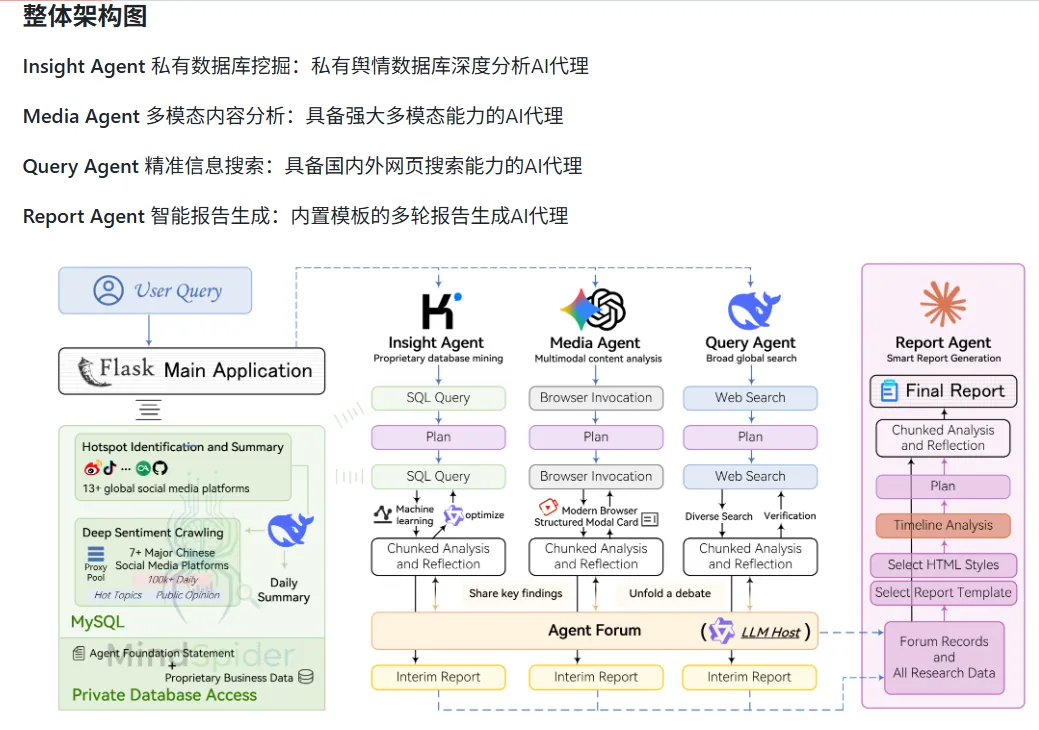 - 多 Agent 协作体系:Query Agent(精准搜索)、Media Agent(多模态解析)、Insight Agent(私有数据挖掘)、Report Agent(报告生成)分工明确,通过“论坛机制”进行思维碰撞,避免单一模型局限