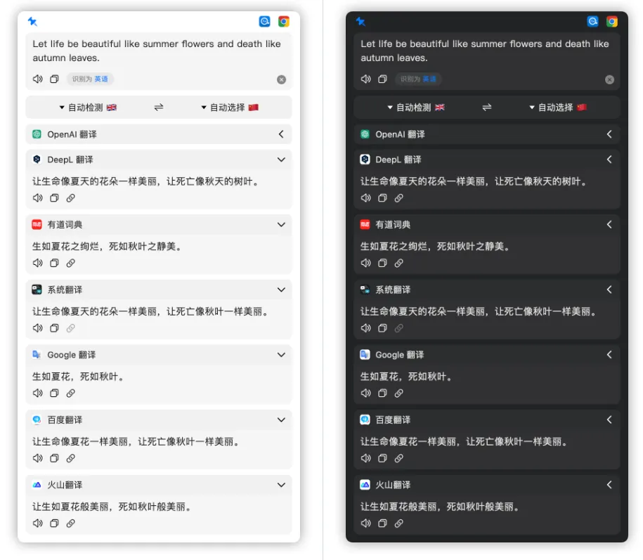 - 划词翻译:选中文本即可自动翻译,支持多种触发方式