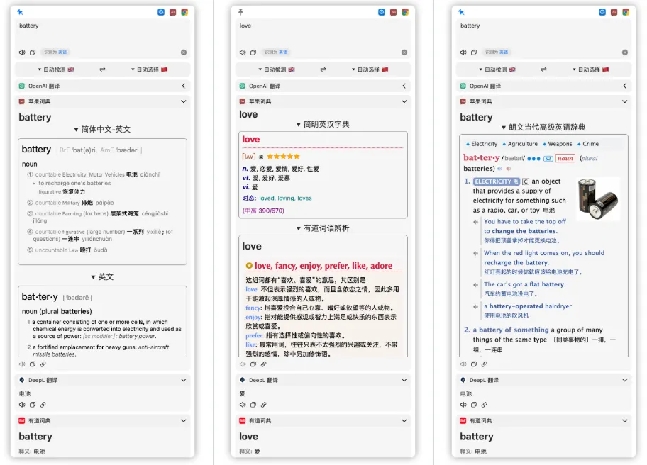 Easydict是一个基于 macOS 的开源翻译工具,支持划词翻译、截图翻译、输入翻译等多种方式。它集成了多个翻译服务,包括 DeepL、Google、OpenAI 等,让你在写代码、看文档、浏览网页时都能快速获取翻译结果。